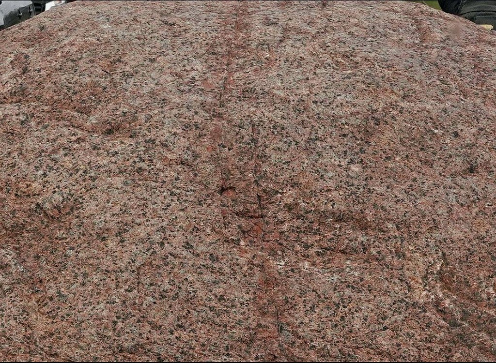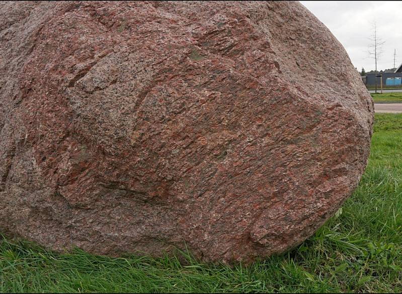De bijna 6 ton zware Aland-rapakivi van Donkerbroek (Fr.), met aan de voorzijde een roder deel. Dit is een vlak aangesneden breukzone, waar het gesteente door hematiet roder is