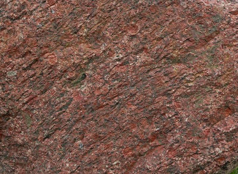 De vlak aangesneden breukzone toont een karakteristiek patroon van evenwijdig lopende splijtreten. Het oppervlak doet enigszins aan dat van een wasbord denken. Op het rode breukvlak zijn een aantal witgeringde ovoïden zichtbaar.
