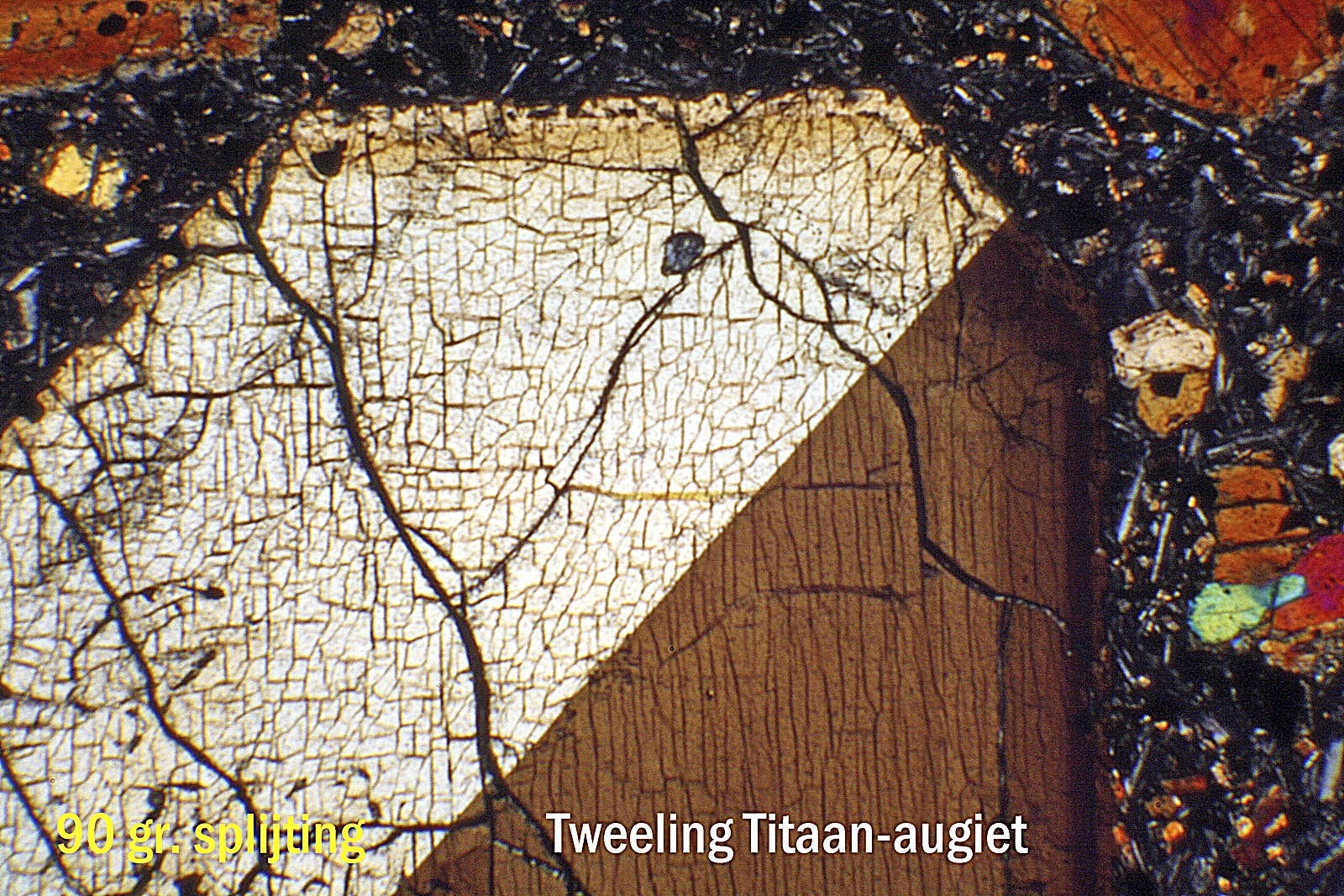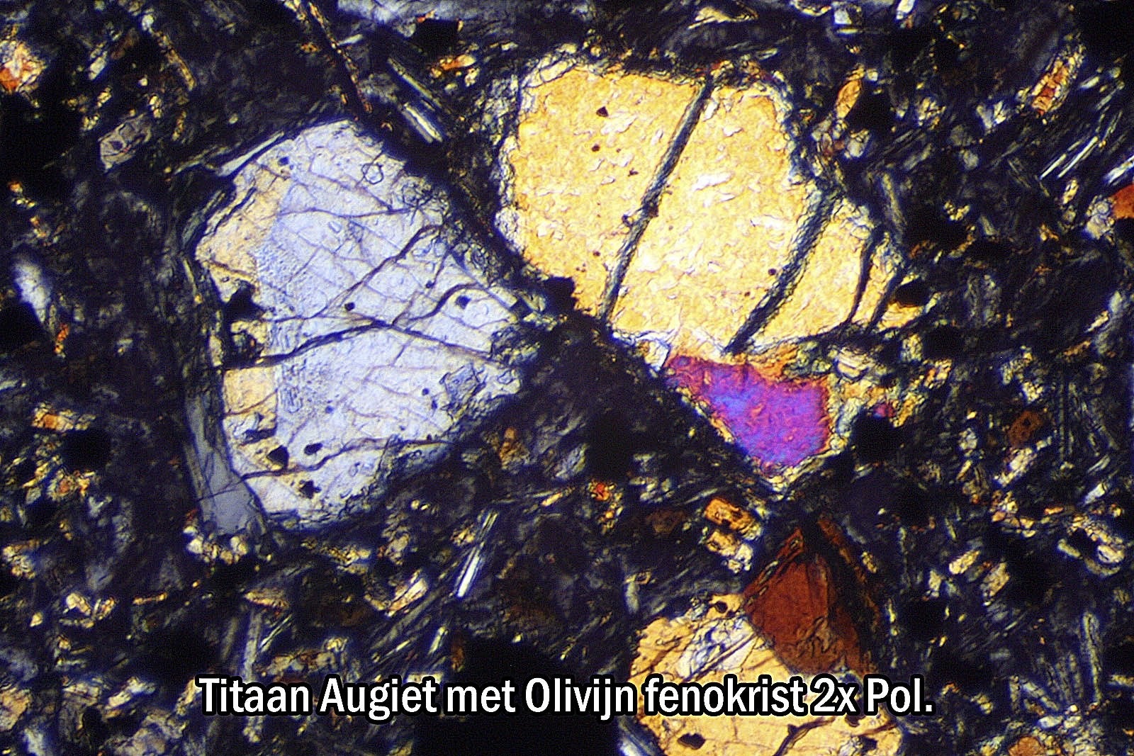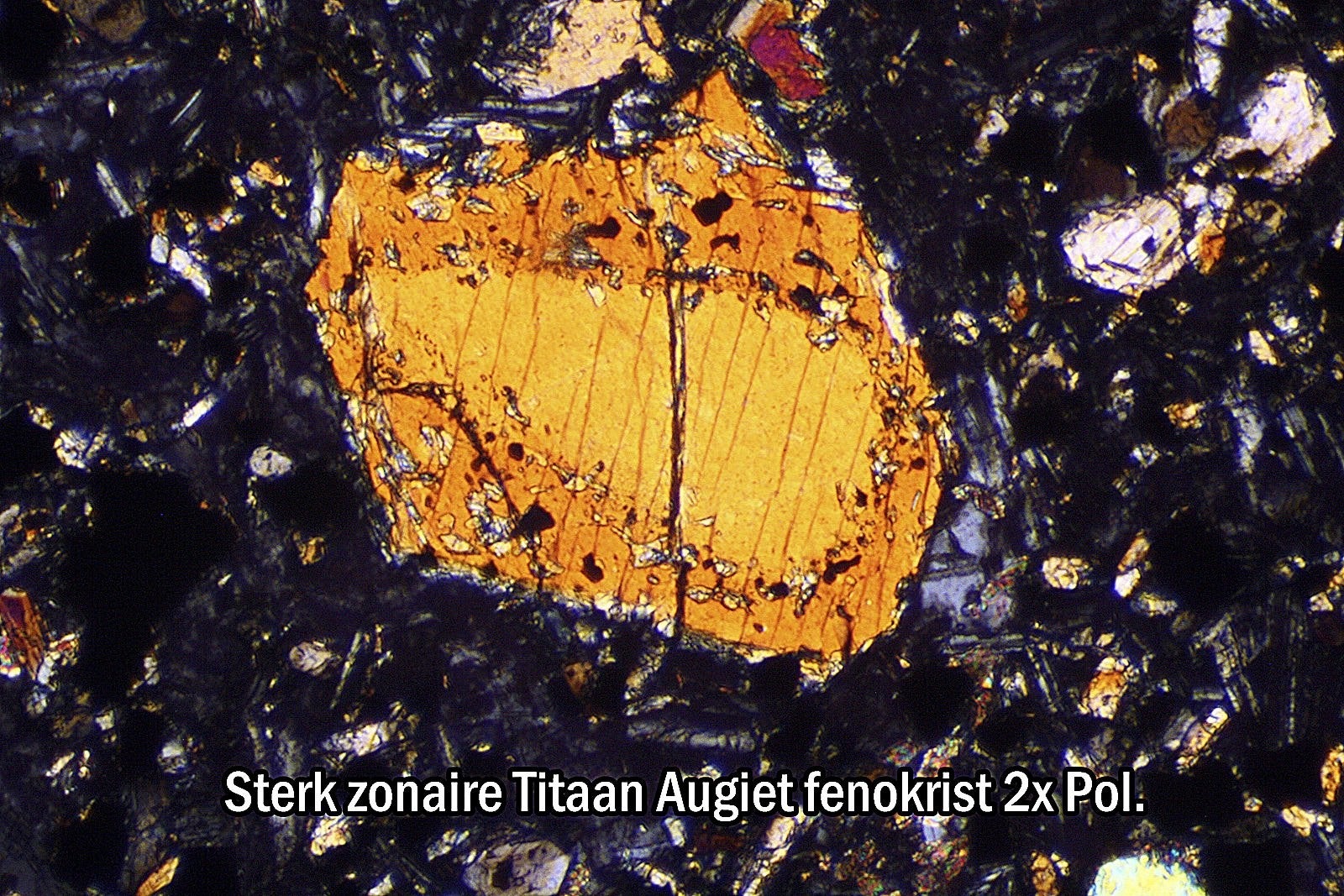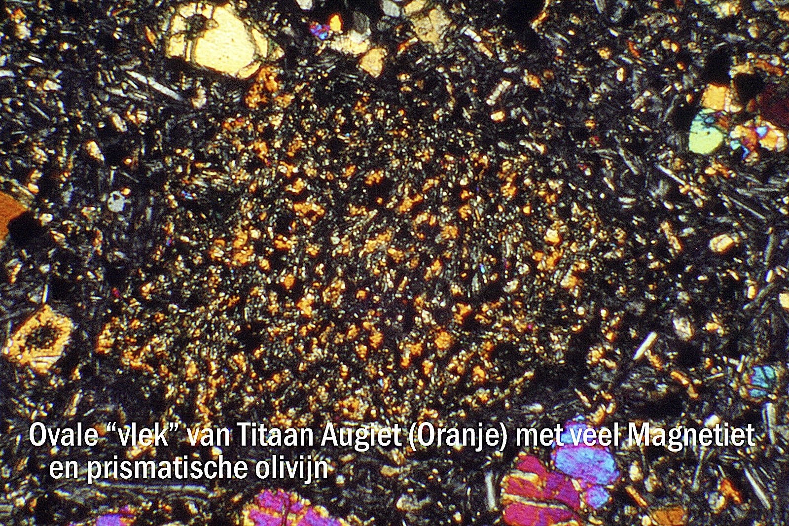 - fenokristen van titaan-augiet, vaak sterk zonair, met zandloperstructuur. In enkele titaan-augieten komen “vlekken” voor, met heel veel magnetiet en prismatische olivijn (met hoge interferentie-kleuren), die tezamen een donker geheel vormen.