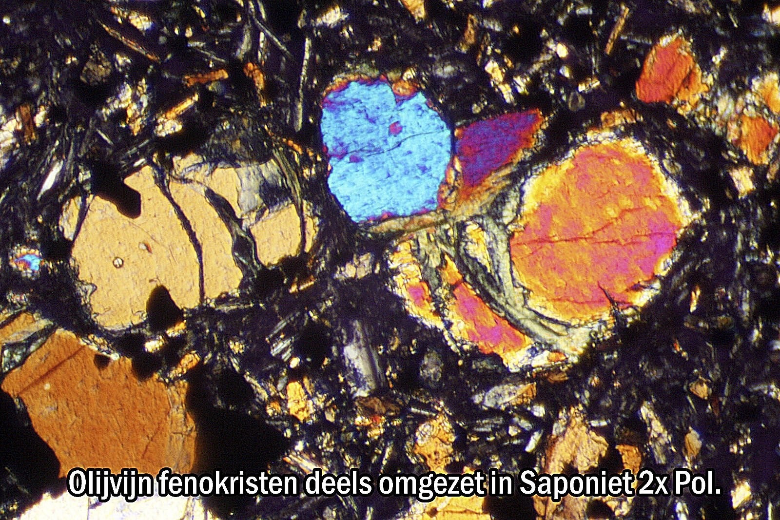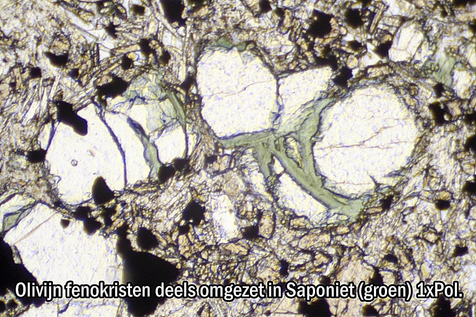 - fenokristen van olivijn (forsteriet), vaak sterk gecorrodeerd en deels omgezet saponiet, soms ook iddingsiet.