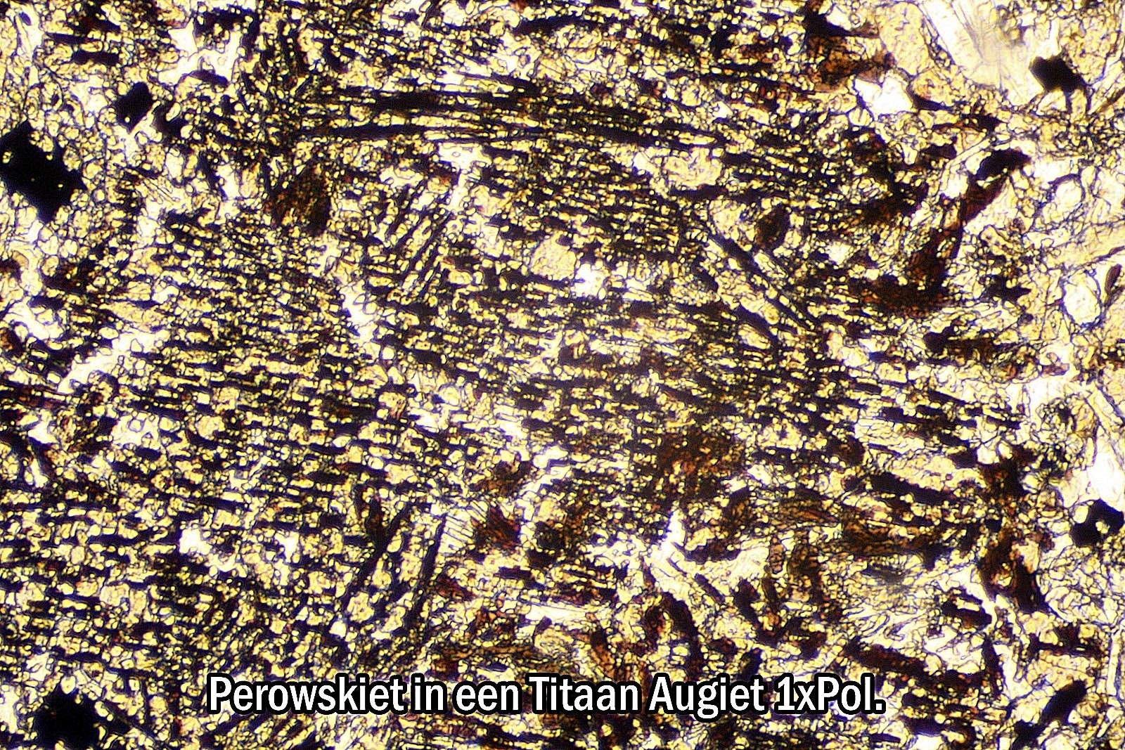 - in enkele “donkere” vlekken in de titaan-augiet, magnetiet en veel perowskiet.