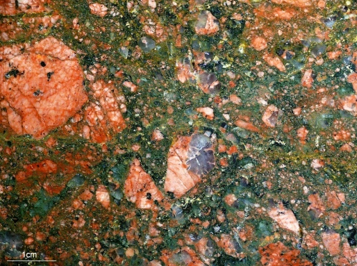 Foto 15. Åland-rapakivi met groene epidoot. Zwerfsteen van Haddorf (Dld.)