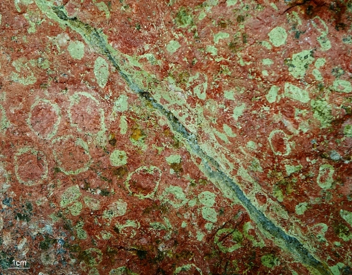Foto 9. Åland-rapakivi met kwartsbreuk en epidootzone. Zwerfsteen van Emmerschans