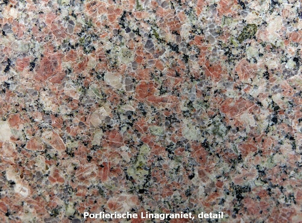 Porfierische Linagraniet - zwerfsteen van Klazienaveen (Dr.). Detail met hoog roze-rode kaliveldspaten en groenige plagioklaas.