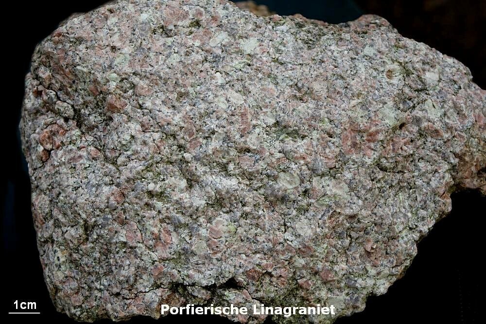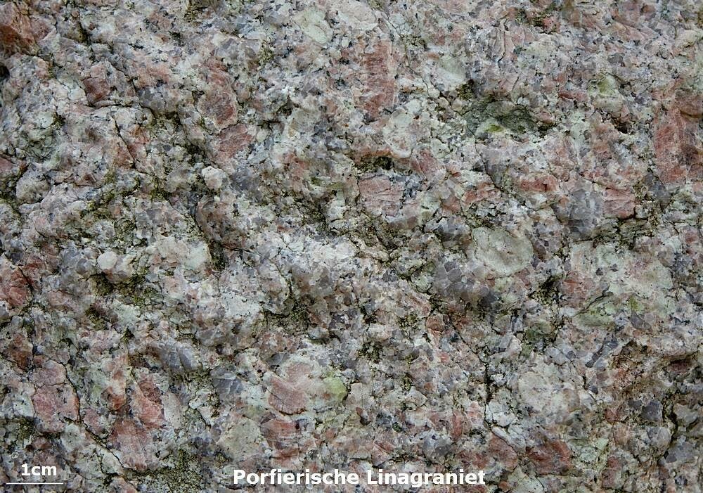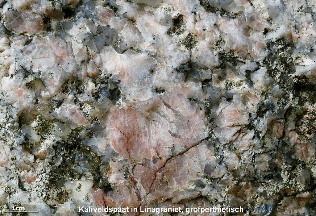 Porfierische Linagraniet - Zwerfsteen van Nieuw-Dordrecht (Dr.) Deze graniet toont deformatieverschijnselen. Veldspaten, zowel plagioklaas als kaliveldspaat tonen met kwarts gevulde breukjes.