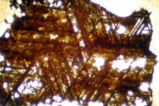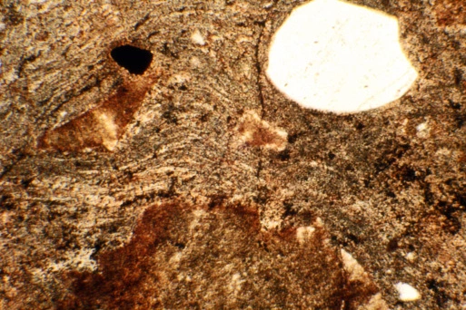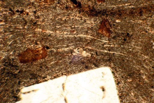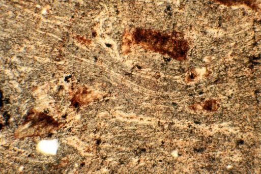 De lichtere lagen (flows) bevinden zich in een donkerder matrix van compacte asdeeltjes, die zijn ontglaasd en gerekristalliseerd, alsmede van kwarts, veldspaat en fenokristen hiervan. De mobiele vloeistructuur is duidelijk te zien op foto’s van het slijpplaatje.